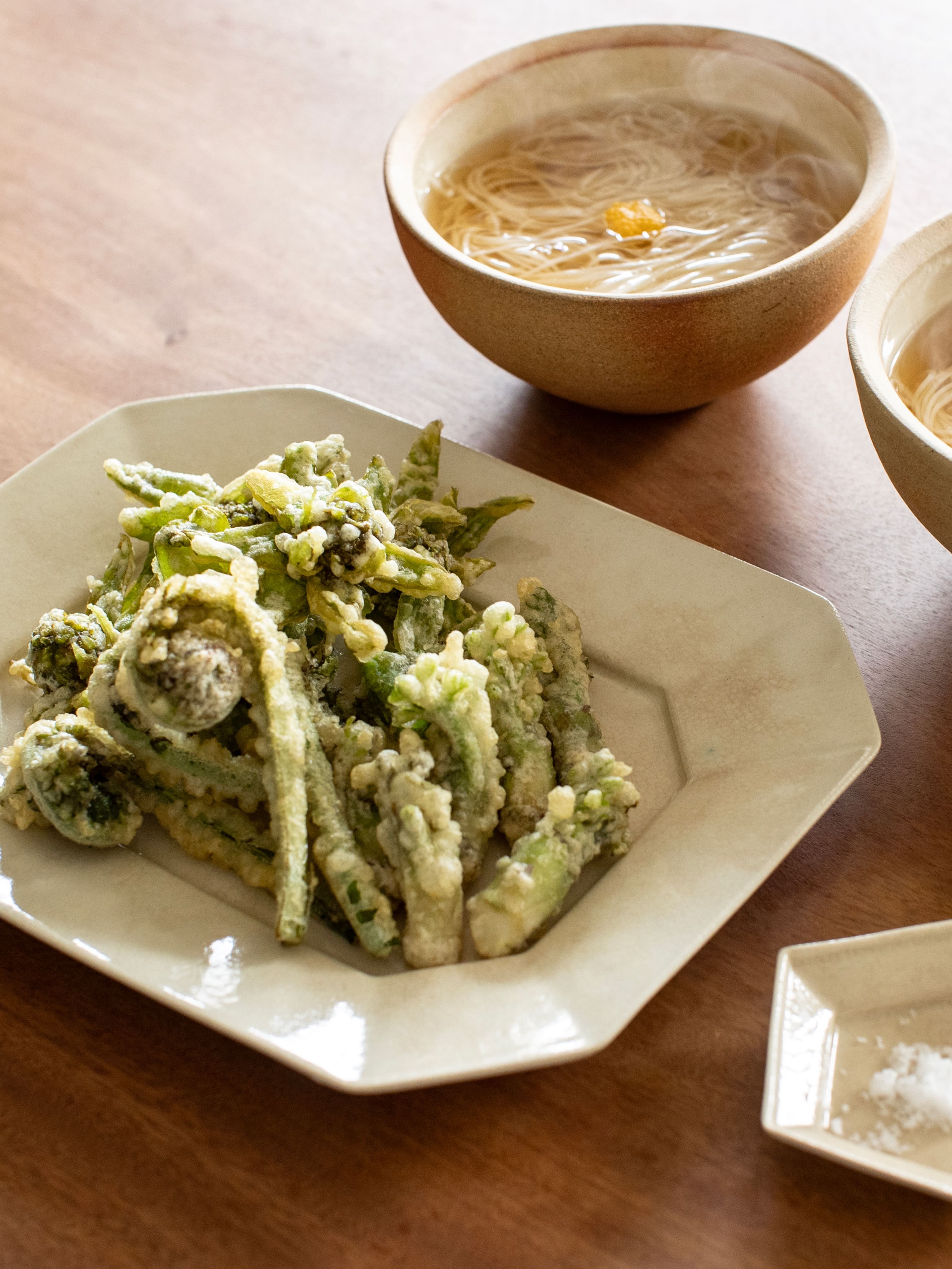 春の香りをいの一番に楽しむ、素朴で贅沢な天ぷらを、あつあつのにゅうめんと共に。